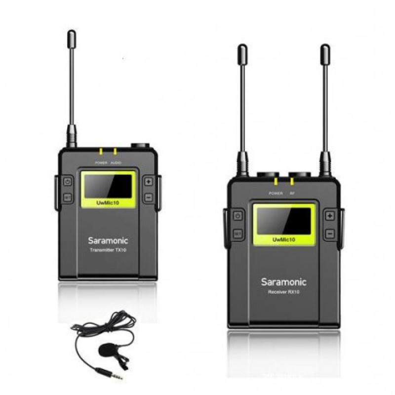 Il pacchetto UHF microfono wireless della Saramonic è composto da un trasmettitore TX9, un ricevitore RX9 e un microfono lavalier.